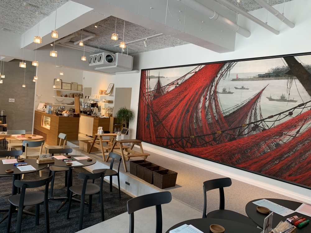 店内は日本画家で有名な「山田 毅」氏の迫力ある絵がどーんと飾られており、