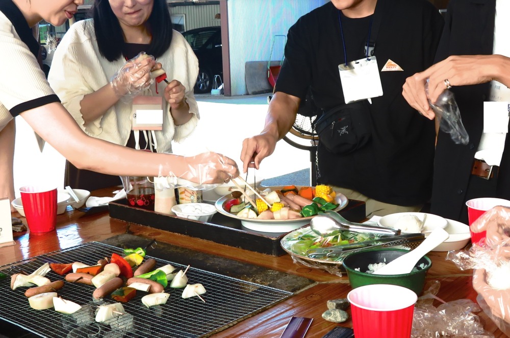 今回お邪魔した「ときわ野」さんが愛情込めて作ったお野菜とバジルの効いたソーセージなどを串に刺したり、そのまま網へ乗せたりグループごとに自由に焼き焼き♪