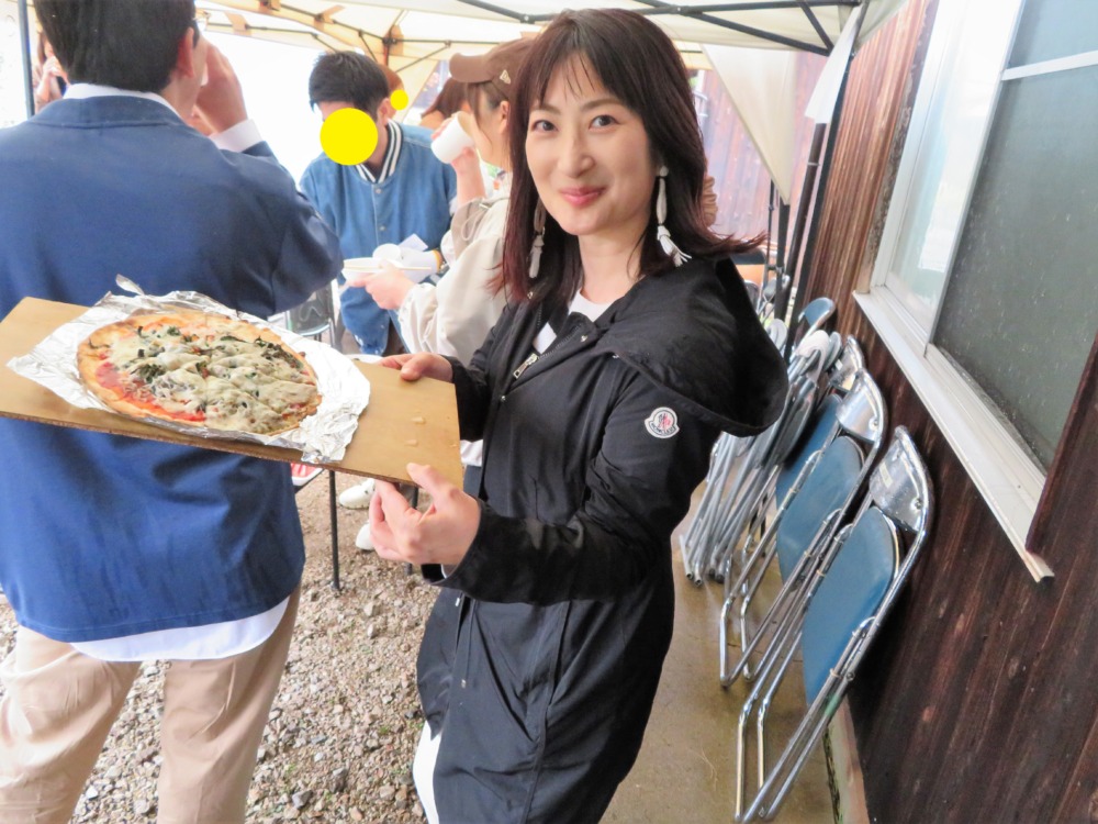 Kiss FM KOBEのラジオDJ珠久美穂子さんが焼き上がったピザを運んでくれています♪