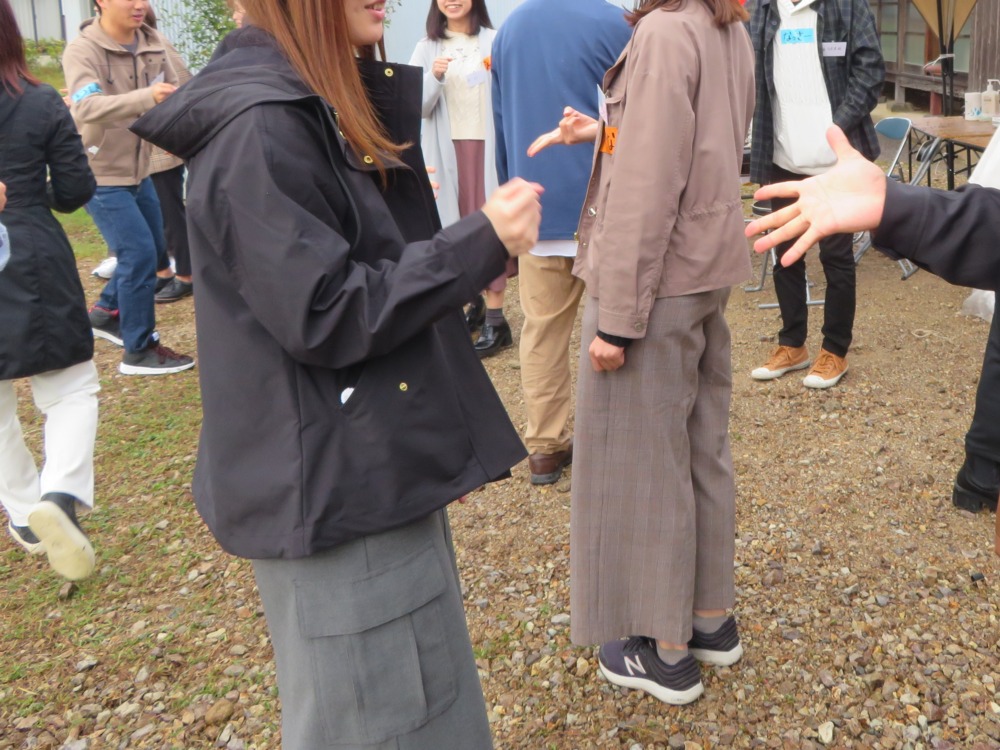 言葉を使わずアイコンタクトやジェスチャー、じゃけんなどを使ってグループに分かれたり誕生日順に並んだりするゲームで、お互いの表情を見ながらなので距離が縮まっていきました。